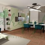 Piano Primo: ingresso nella luminosa zona giorno composta da soggiorno con cucina abitabile a vista e accesso al terrazzo di 19 mq, disimpegno, due spaziose camere da letto e doppi servizi (un bagno finestrato con vasca e un secondo bagno con doccia). (mq 80)